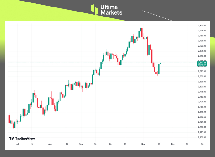 黄金通常被视为经济和地缘政治动荡期间的避险投资,上周经历了三年多来的最大单周跌幅。原因在于,市场担忧当选总统特朗普提议的关税政策可能引发通货膨胀,进而促使美联储放缓降息步伐。然而,本周一,黄金上涨了1.97%,以每盎司2612美元收盘,结束了连续六天的下跌趋势。